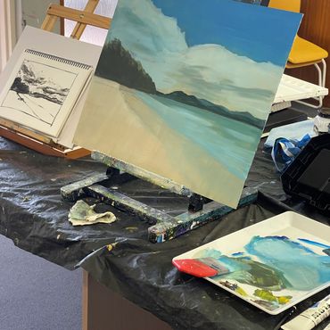 Paint, brushes, a palette, an apron, graphite pencil, eraser, notebook, and an A4 or A3 sketchbook of mixed media paper,